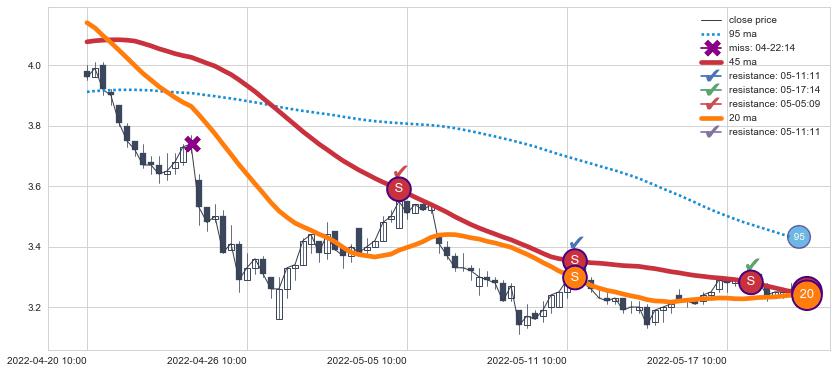 04-20 10:00至05-20 11:00 慢线与快线呈空头排列, 慢线与快线接触少,无缠绕