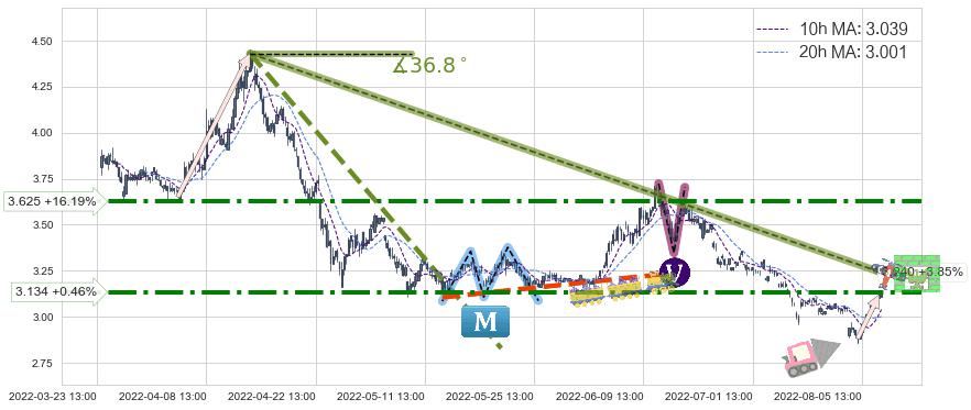 ♘ 阻力价格位3.625,可信任强度79.87%,距离最后交易2022-08-12 14:00形成的收盘价格3.120相差 +16.19%