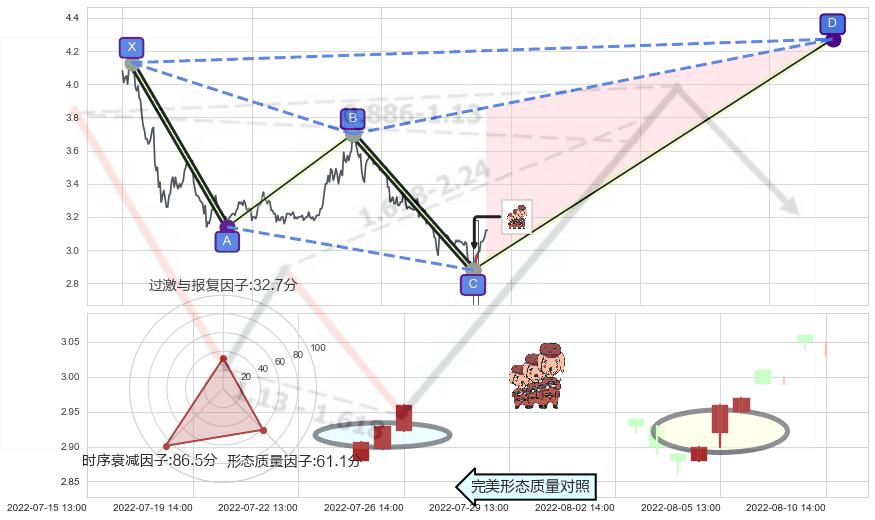 ➢ 🕰 价格走势在2022-08-01 13:00:00至2022-08-01 14:00:00期间形成底部尽头线(上山虎),残存影响值:6.07