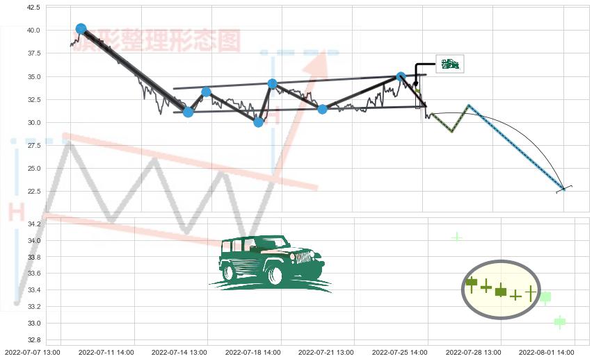 ➢ 看跌(高位倒锤头)流星线 🔜 升旗形支撑破位转换阻力下跌 综合量化分数:42.74 【偏空】