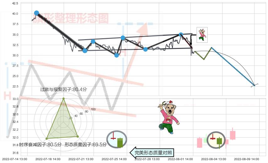 ➢ 🕰 价格走势在2022-08-05 14:00:00至2022-08-09 13:00:00期间形成顶部尽头线(下山虎),残存影响值:-8.20