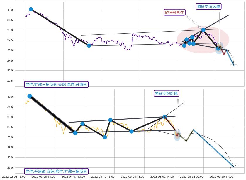 ➢ 顶部尽头线(下山虎) + 扩散三角反转临近支撑猜想转换阻力下跌信号叠加后【反向回撤率】中等,【看空】信号叠加【存续影响中等】