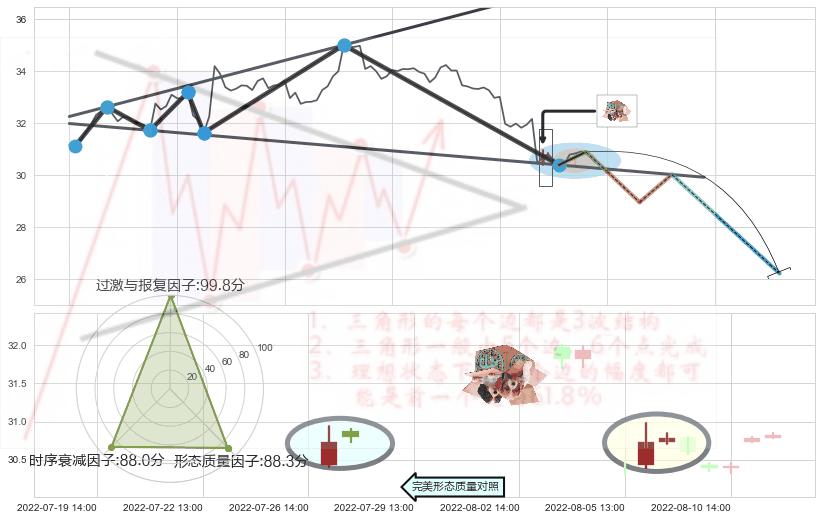 从2022-07-20 14:00至2022-08-12 14:00,共包含33个小时,阶段股价下跌-9.66%,阶段股价变动位移路程比: 1 : 2,2022-08-05 13:00向↘︎形成缺口,跳空下跌-5.38%˚