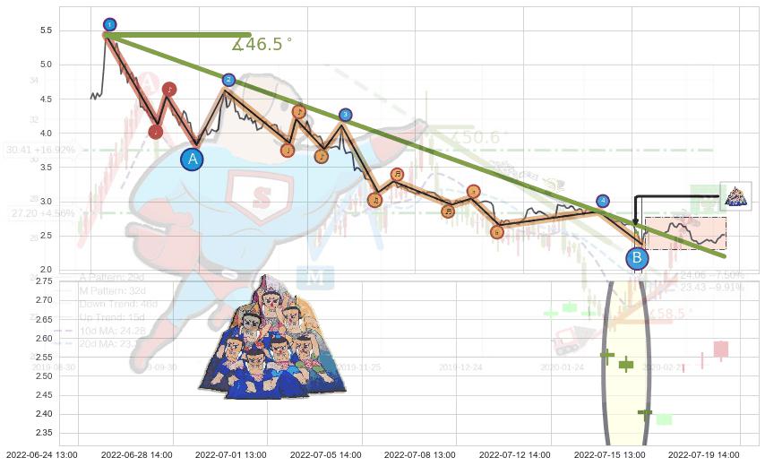 ➢ 2022-04-15 09:00-2022-07-21 14:00下跌趋势存在反转上涨[机会],其原下跌趋势的阻力位(2.194)已被突破[强支撑信号],原下跌趋势角度: 46.5˚