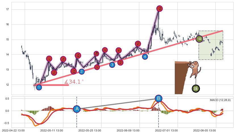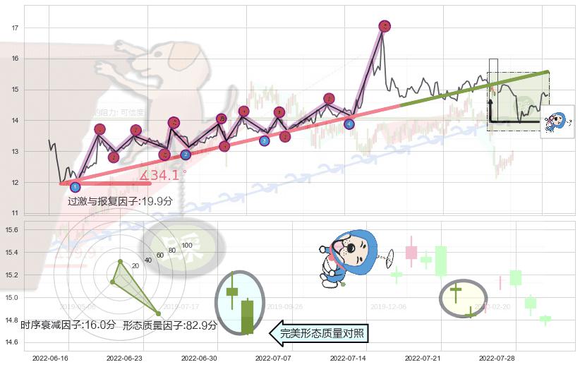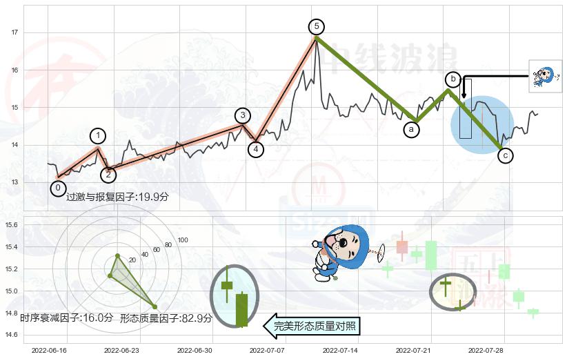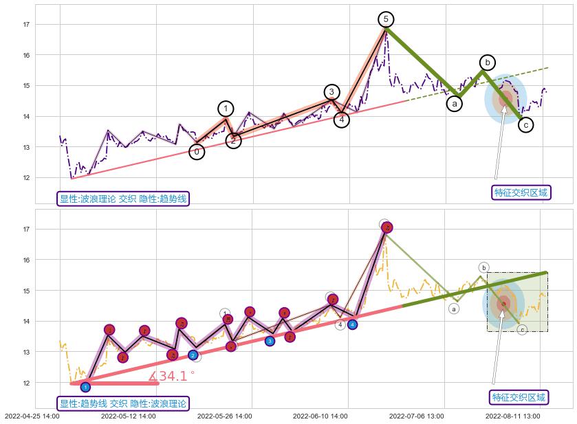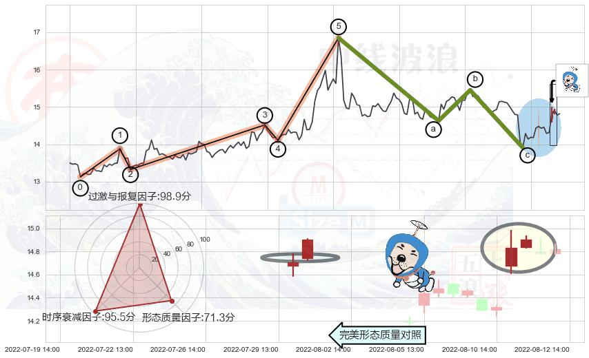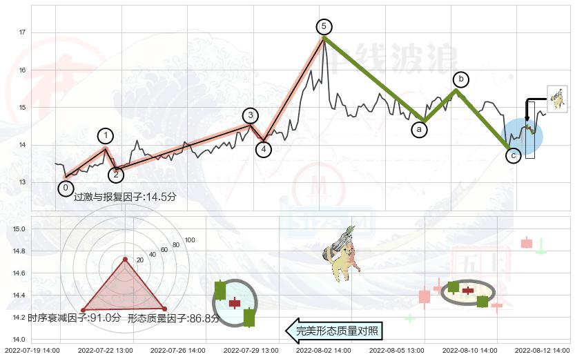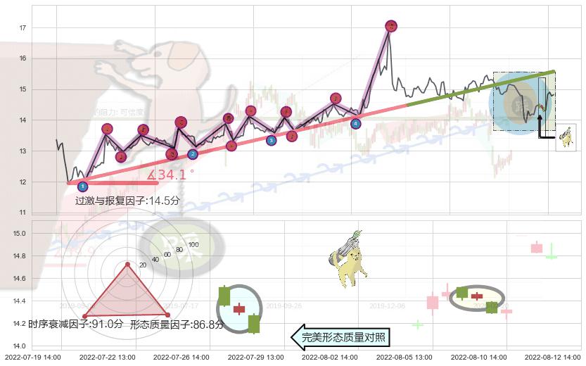 从2022-08-02 14:00至2022-08-12 14:00,共包含15个小时,阶段股价上涨6.47%,阶段股价变动位移路程比: 1 : 2