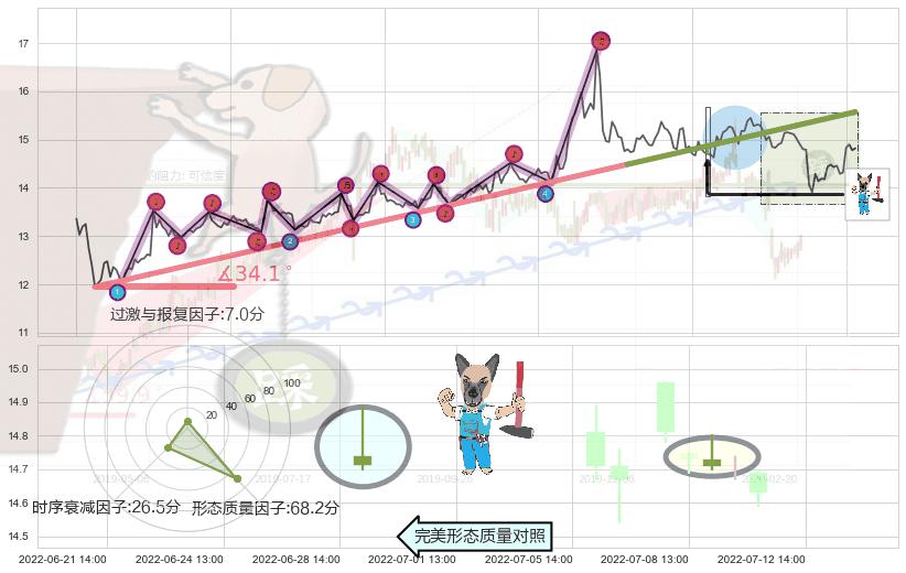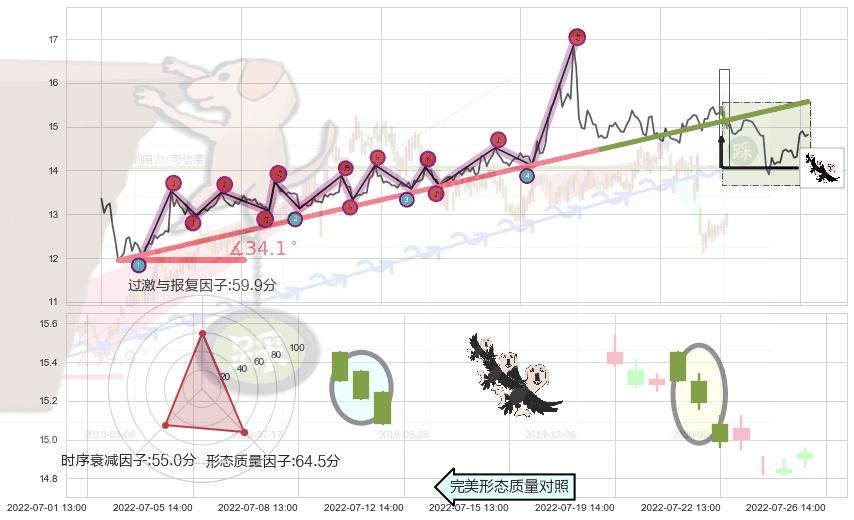 ➣ 2022-04-27 09:00-2022-06-21 14:00上升趋势存在反转[风险],其原上升趋势的支撑位(15.57)已破位[强阻力信号],原上升趋势角度: 34.1˚