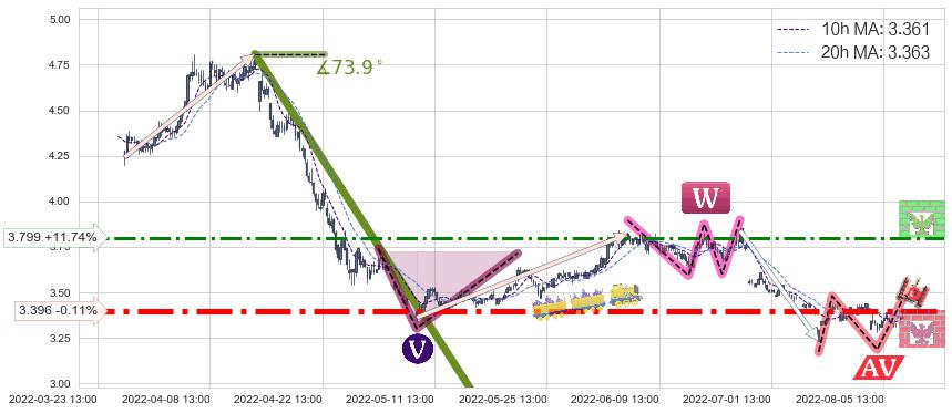 ♘ 阻力价格位3.799,可信任强度67.71%,距离最后交易2022-08-12 14:00形成的收盘价格3.400相差 +11.74%