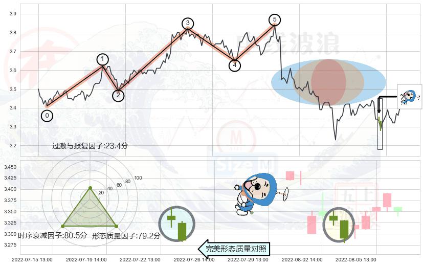 从2022-07-15 14:00至2022-08-12 14:00,共包含39个小时,阶段股价上涨5.32%,阶段股价变动位移路程比: 1 : 4