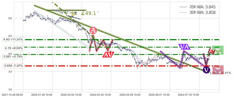 ♘ 阻力价格位3.981,可信任强度57.32%,距离最后交易2022-08-12 14:00形成的收盘价格3.950相差 +0.79%
