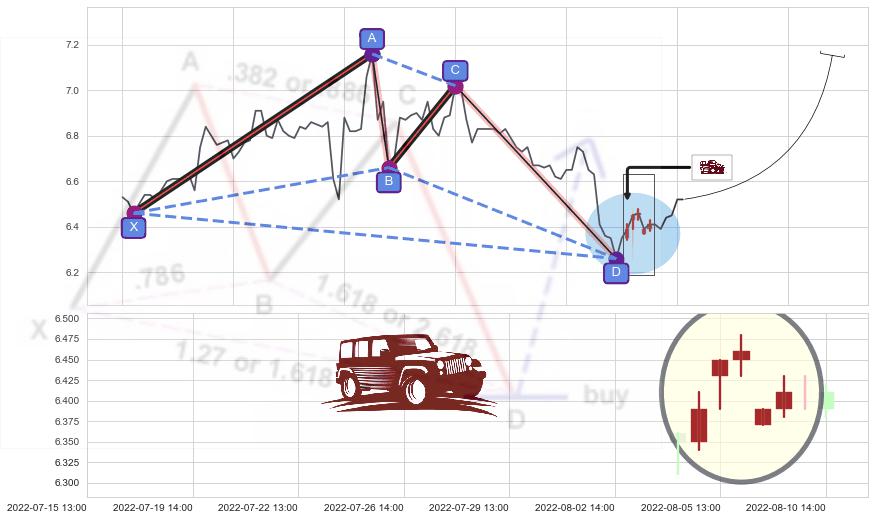➣ 谐波蝴蝶:c下跌到达d:猜想拉升 → 上涨 →【拐点】强支撑临近 → 大趋势均值回复