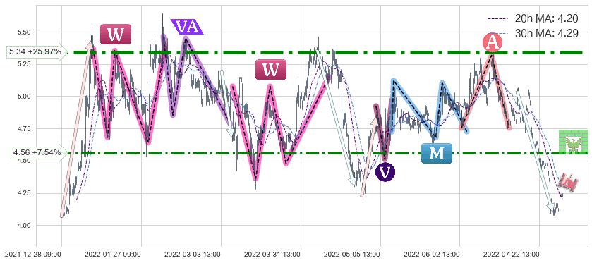 ♘ 阻力价格位4.56,可信任强度64.02%,距离最后交易2022-08-12 14:00形成的收盘价格4.24相差 +7.54%