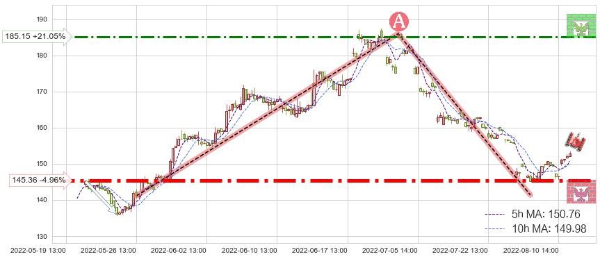 ♘ 阻力价格位185.15,可信任强度58.58%,距离最后交易2022-08-12 14:00形成的收盘价格152.95相差 +21.05%