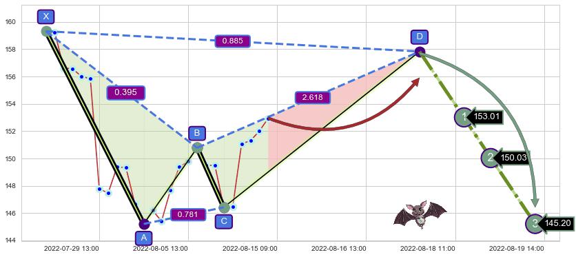 ➣ 谐波蝙蝠:b下跌接近c:猜想支撑性拉升 → 上涨 →【拐点】支撑临近 → 大趋势均值回复