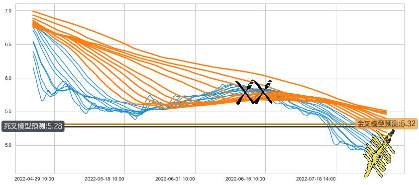 ➢ 60小时均线于(06-13 10:00: 5.78)形成【死叉】基于【死叉历史模型】预测死叉后最低波谷价格: 5.30, 死叉后最低价格4.64,已经下跌超出预测最低波谷价格, 预期反弹