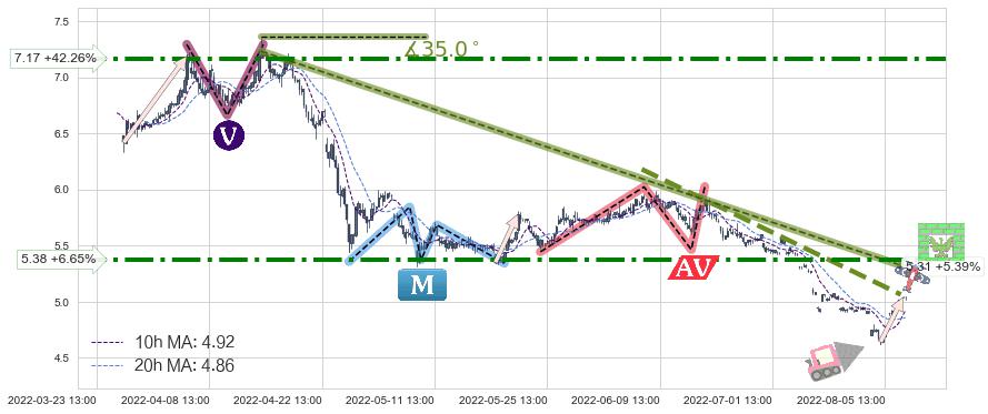 ♘ 阻力价格位7.17,可信任强度73.36%,距离最后交易2022-08-12 14:00形成的收盘价格5.04相差 +42.26%
