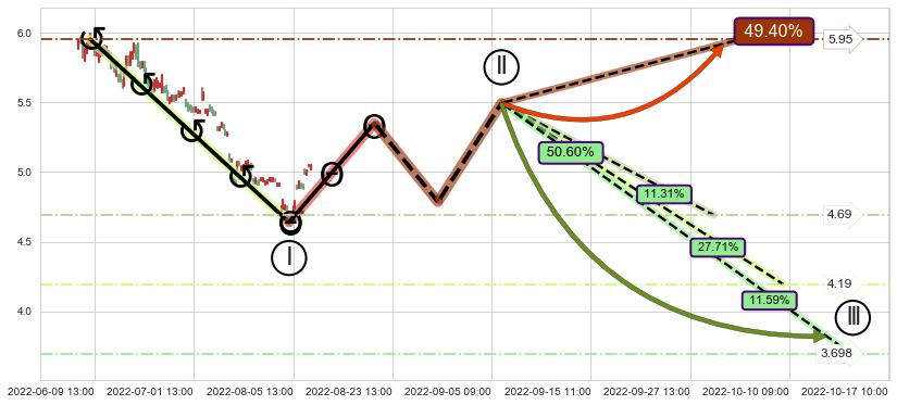 ➢ 循环浪继续向下【最低】位置(10-17:10, 3.698),匹配聚类样本比例22.90%, 可能性概率11.59%