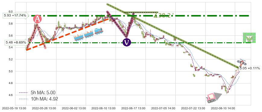 ♘ 阻力价格位5.48,可信任强度58.83%,距离最后交易2022-08-12 14:00形成的收盘价格5.04相差 +8.69%