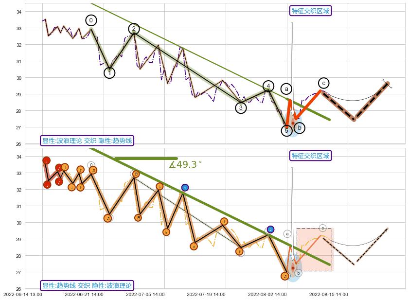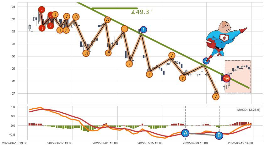 ➣ 2022-06-14 14:00-2022-08-02 14:00下跌趋势存在反转上涨[机会],其原下跌趋势的阻力位(27.44)已被突破[强支撑信号],原下跌趋势角度: 49.3˚