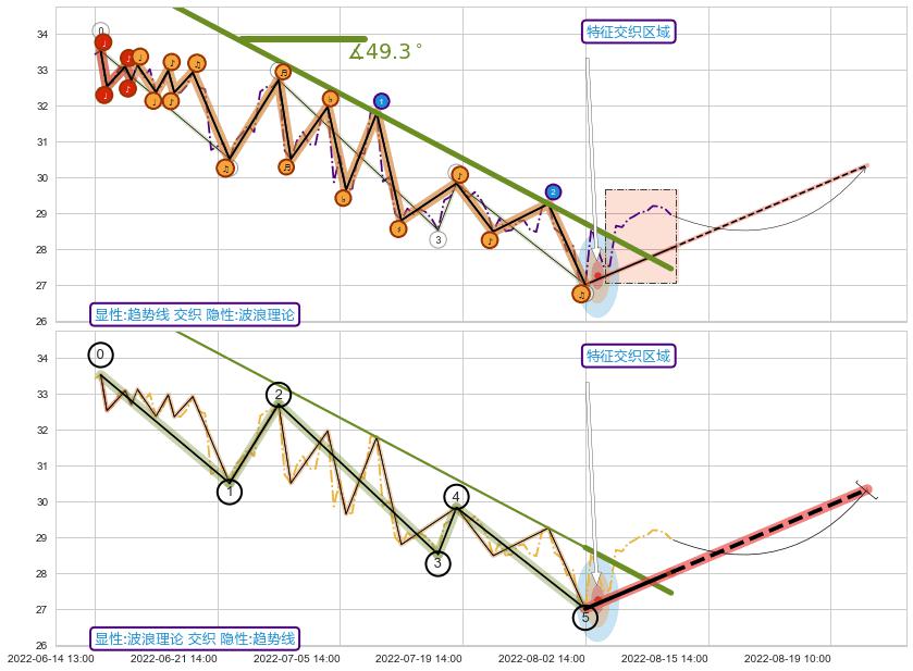 ➢ 2022-06-14 14:00-2022-08-02 14:00下跌趋势存在反转上涨[机会],其原下跌趋势的阻力位(27.44)已被突破[强支撑信号],原下跌趋势角度: 49.3˚