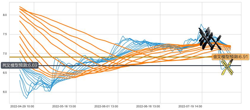 ➢ 45小时均线于(07-22 14:00: 7.33)形成【死叉】基于【死叉历史模型】预测死叉后最低波谷价格: 6.72, 死叉后最低价格6.46,已经下跌超出预测最低波谷价格, 预期反弹