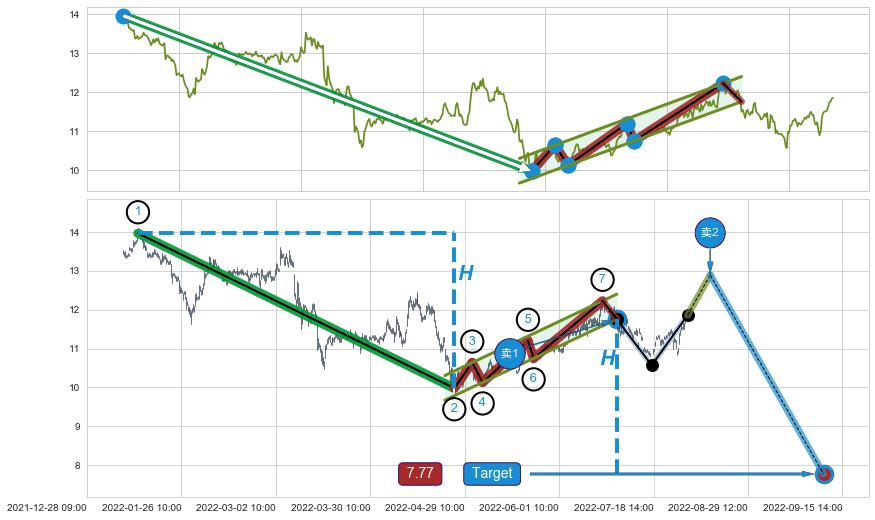 ➣ 最小中继整理跌幅→𝐇: 2.220 (上平行阻力线与下平行支撑线的垂直距离)