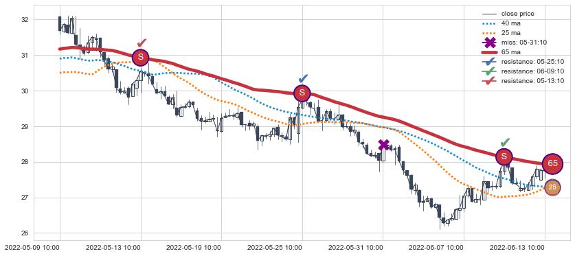 📝 多条均线形成死叉后走势最低价格达到: 25.33