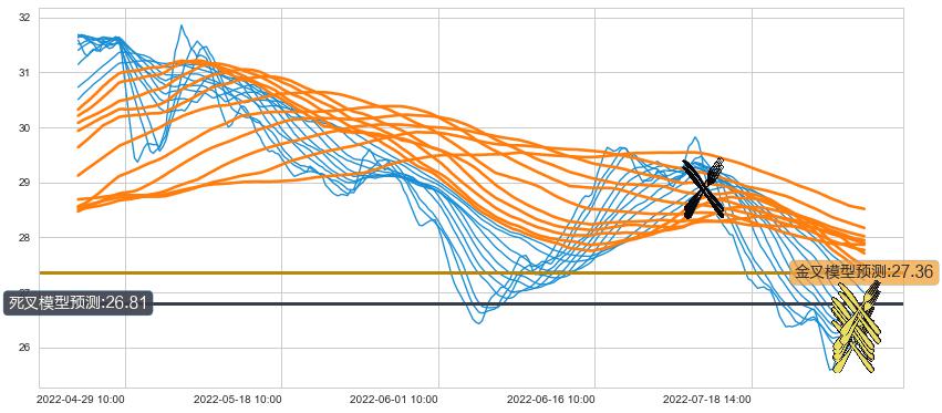 ➣ 60小时均线于(07-06 14:00: 28.82)形成【死叉】基于【死叉历史模型】预测死叉后最低波谷价格: 26.71, 死叉后最低价格25.33,已经下跌超出预测最低波谷价格, 预期反弹