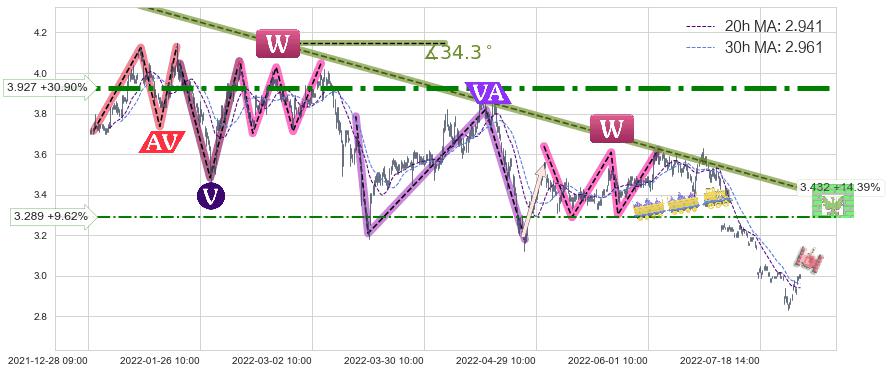 ♘ 在最后的下跌阶段2022-01-11 11:00至2022-08-12 14:00,存在 持续未破位的阻力位 ,阻力价格3.432,可信任强度87.36%,其距离最后价格3.000相差 +14.39%