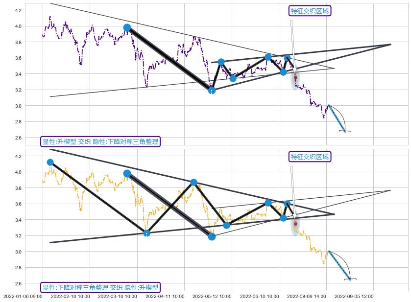➢ 下降对称三角整理:下行突破支撑位破位, 猜想持续下沉下跌,被突破的支撑位已变为阻力位