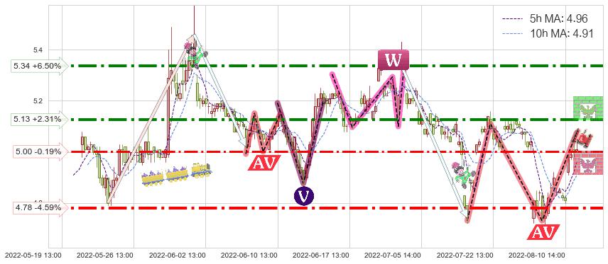 ♘ 阻力价格位5.34,可信任强度70.59%,距离最后交易2022-08-12 14:00形成的收盘价格5.01相差 +6.50%