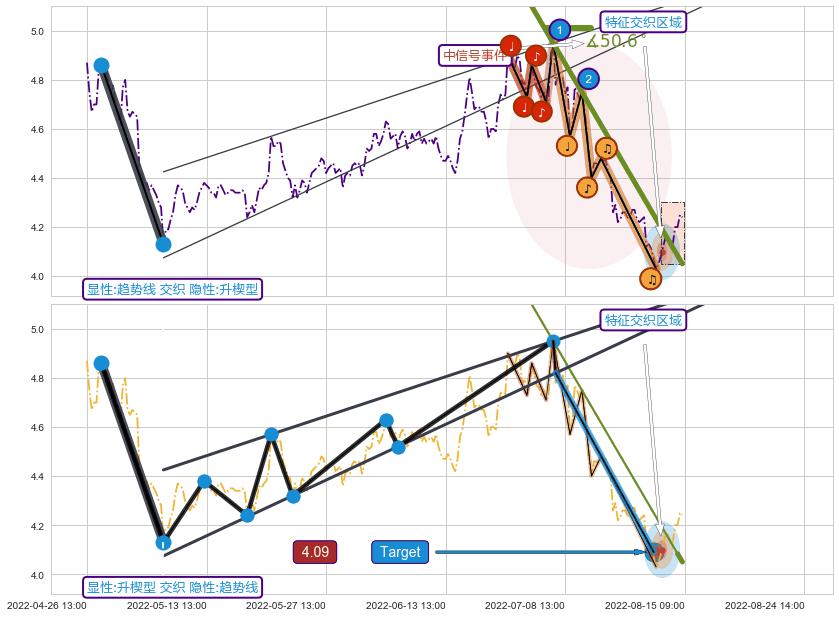➢ 2022-06-22 13:00-2022-08-11 14:00下跌趋势存在反转上涨[机会],其原下跌趋势的阻力位(4.05)已被突破[强支撑信号],原下跌趋势角度: 50.6˚