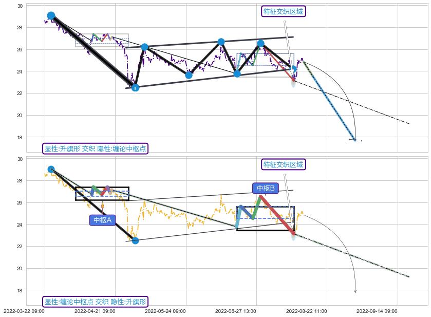➣ 缠论中枢点:猜想破位中枢B后持续下拉 → 下跌 → 破位中枢B支撑 → 持续趋势跟踪