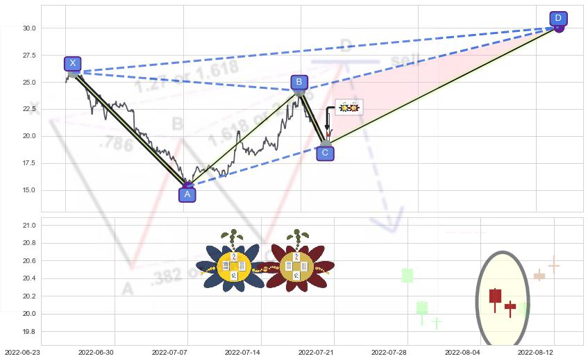 ➢ 谐波蝴蝶:b下跌接近c:猜想支撑性拉升 → 上涨 →【拐点】支撑临近 → 大趋势均值回复