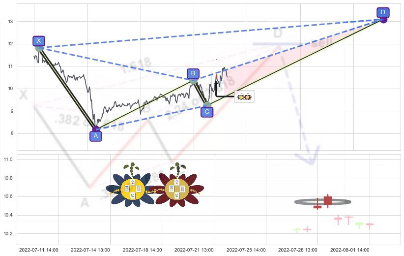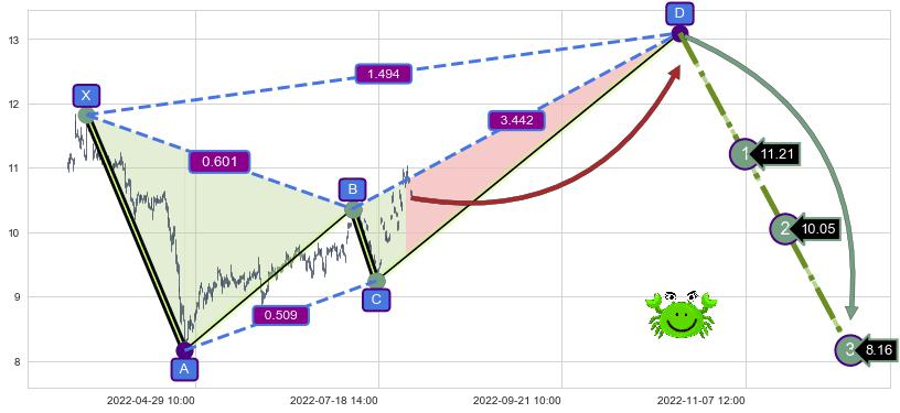 ➢ 谐波螃蟹:b下跌接近c:猜想支撑性拉升 → 上涨 →【拐点】支撑临近 → 大趋势均值回复