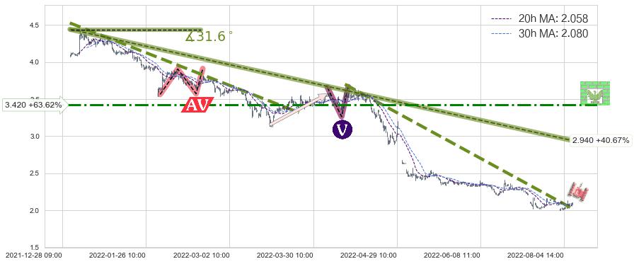 ♘ 阻力价格位3.420,可信任强度60.76%,距离最后交易2022-08-12 14:00形成的收盘价格2.090相差 +63.62%