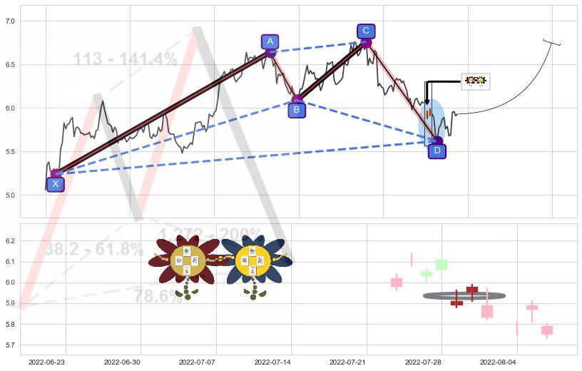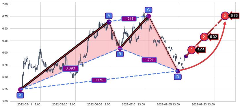 ➣ 谐波赛福:c下跌到达d:猜想拉升 → 上涨 →【拐点】强支撑临近 → 大趋势均值回复