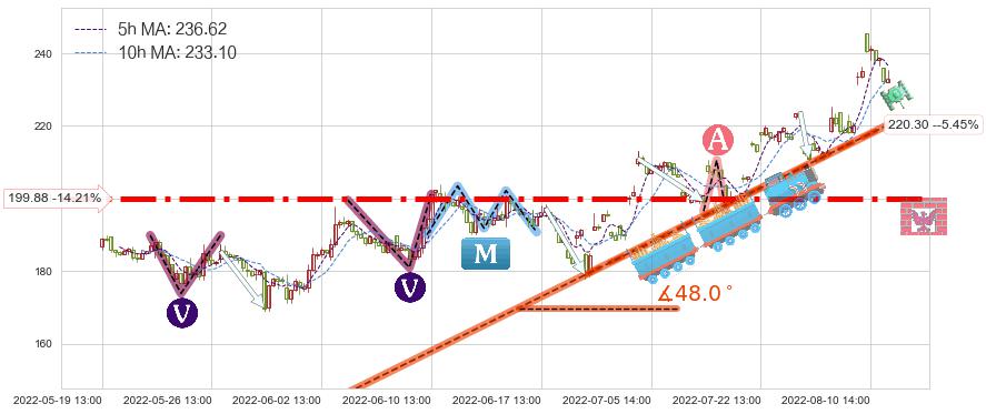 ♘ 支撑价格位199.88,可信任强度97.03%,距离最后交易2022-08-12 14:00形成的收盘价格232.99相差 -14.21%