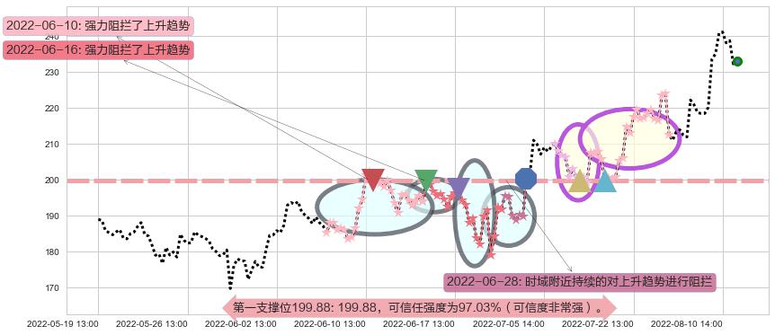 2022-06-17: 第一支撑位199.88强力阻拦了上升趋势,成功阻止了价格的继续上涨。