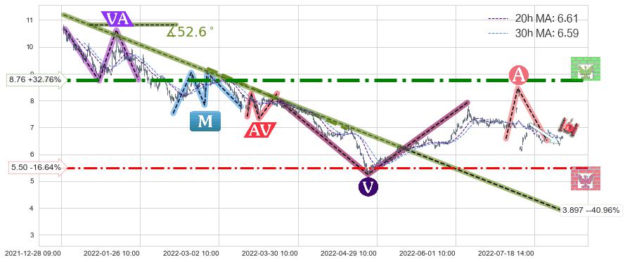 从2021-12-28 13:00至2022-05-12 09:00,共包含427个小时,阶段股价下跌-51.14%,阶段股价变动位移路程比: 1 : 8,下跌趋势角度: 52.6