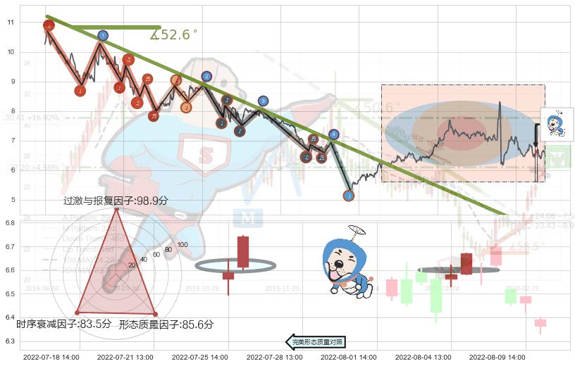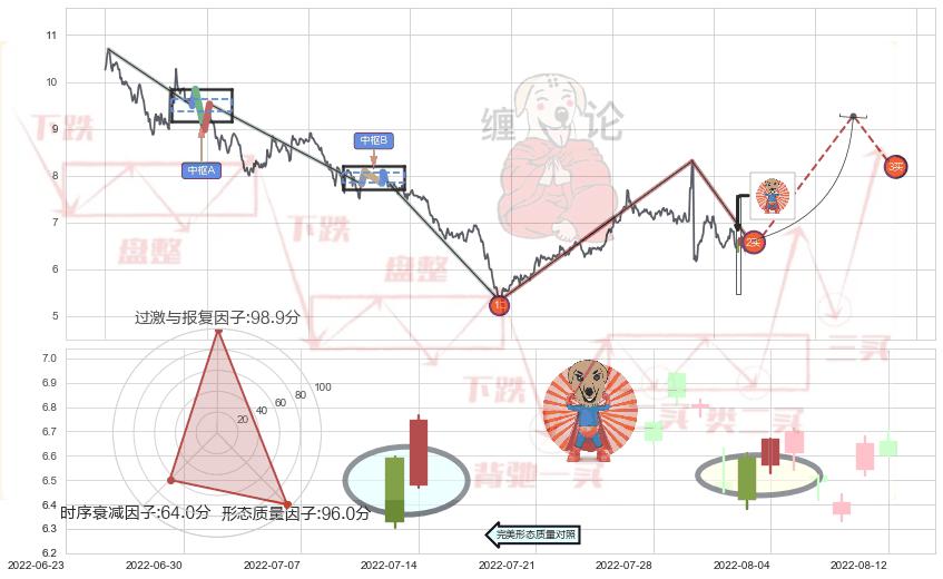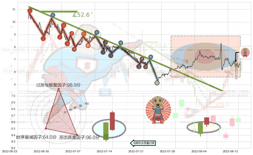 从2022-07-13 14:00至2022-08-12 14:00,共包含43个小时,阶段股价下跌-7.28%,阶段股价变动位移路程比: 1 : 7