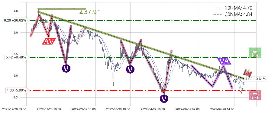 ⚔️ 2022-01-07 09:00-2022-06-21 13:00下跌趋势存在反转上涨[机会],虽然原下跌趋势的阻力位(4.92)已被突破,但其阻力效果尚存,原下跌趋势角度: 37.9˚