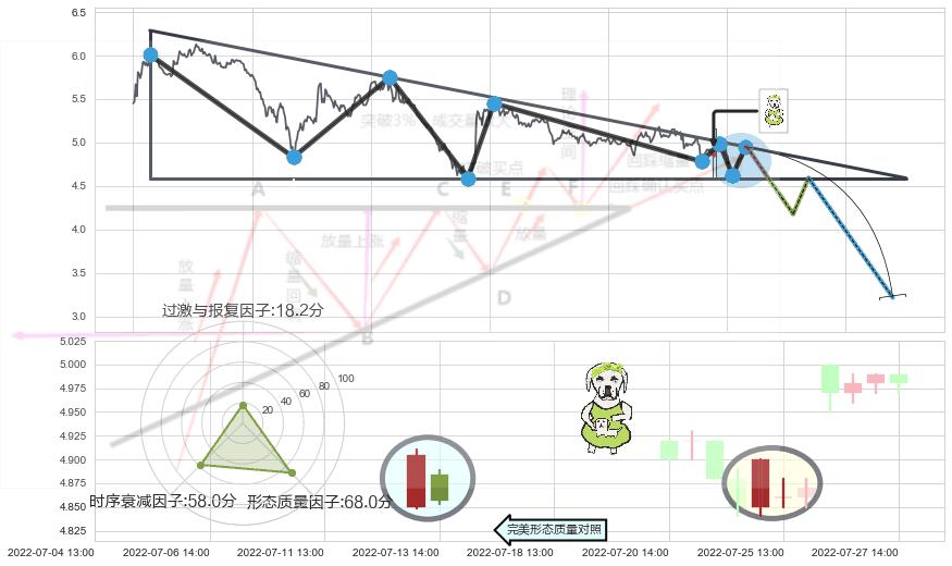 ➢ 下跌身怀六甲 🔜 下降三角整理临近支撑猜想转换阻力下跌 综合量化分数:46.97 【中性】