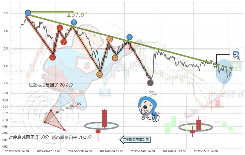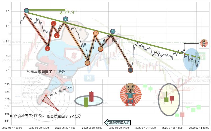 ➣ 2022-01-07 09:00-2022-06-21 13:00下跌趋势存在反转上涨[机会],虽然原下跌趋势的阻力位(4.92)已被突破,但其阻力效果尚存,原下跌趋势角度: 37.9˚