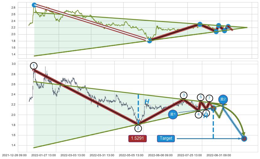 ➣ 下降对称三角整理:猜想临近关键支撑位突破点 → 临近拐点下跌 → 风险信号 → 大趋势均值回复