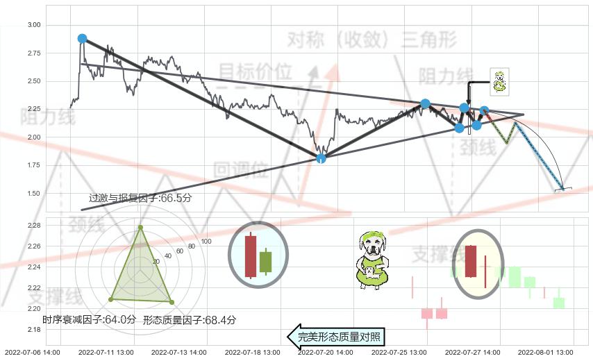 ➢ 下跌身怀六甲 🔜 下降对称三角整理临近支撑猜想转换阻力下跌 综合量化分数:45.86 【偏空】
