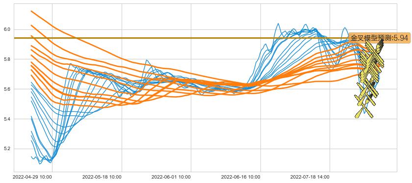 ➢ 70小时均线于(08-10 14:00: 5.85)形成【金叉】基于【金叉历史模型】预测金叉后最高波峰价格: 6.06, 金叉后最高价格5.91,尚未达到预测最高波峰价格, 预期继续上涨