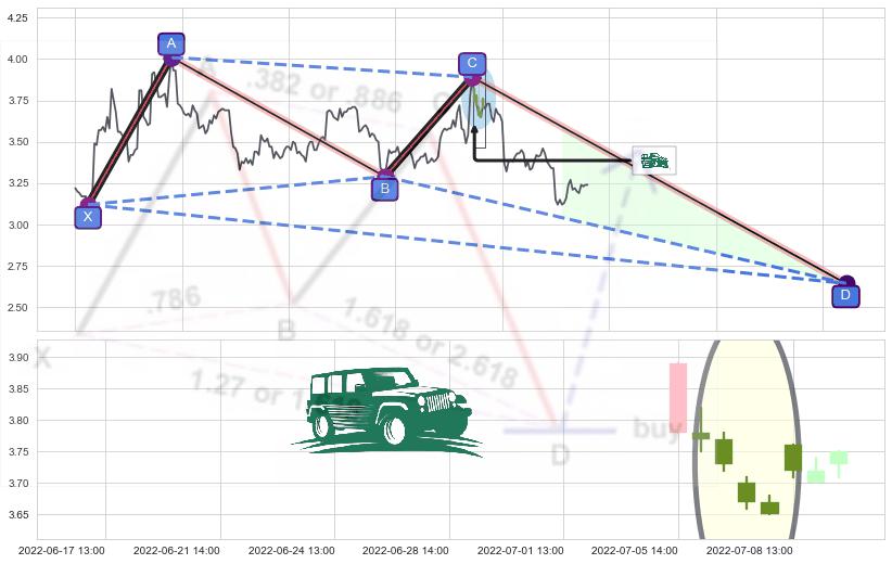 ➢ 谐波蝴蝶:b上拉接近c:猜想阻力性下沉 → 下跌 →【拐点】阻力临近 → 大趋势均值回复