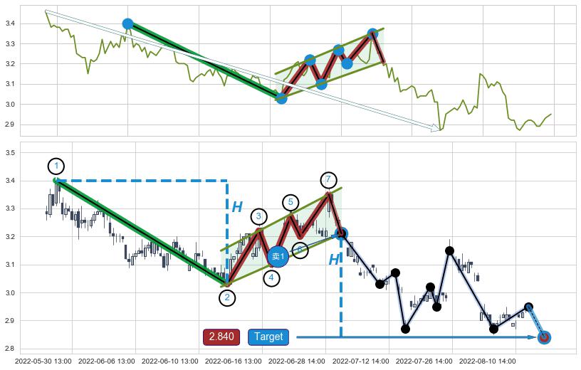 ➣ 升旗形:猜想预期下跌目标target即将达成,随后猜想强支撑来临,预期反弹上涨(均值回复)