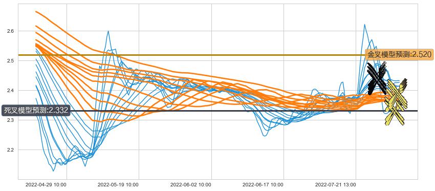 ➢ 30小时均线于(08-01 14:00: 2.452)形成【死叉】基于【死叉历史模型】预测死叉后最低波谷价格: 2.354, 死叉后最低价格2.300,已经下跌超出预测最低波谷价格, 预期反弹