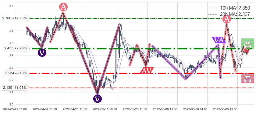 ♘ 阻力价格位2.455,可信任强度92.79%,距离最后交易2022-08-12 14:00形成的收盘价格2.400相差 +2.28%